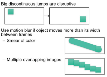 Big jumps are disruptive, so pay attention when you're using low frame rates with high object speeds. In the real world, an object doesn't disappear from one place and reappear in another – it passes through the intervening points, and even if it moves too fast for us to focus on it, it leaves an impression of its path in our visual system – a smear. That smear is called motion blur. If an object is moving so fast that it moves more than its own width between frames, leaving a visible gap between subsequent images of the object, then you should consider filling in the gap with simulated motion blur. Two common ways to do it: (1) a smear of the object's color, and (2) simply drawing multiple overlapping images of the object. Another solution is to crank up the frame rate, if that's possible.
