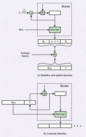 The generate phase of CTR_DRBG is given the values of the key and V from the initialize or update phase. One output block at a time is generated and the encryption function is iterated to generate the number of bits desired. Each iteration uses the same encryption key, but V is incremented by 1 for each iteration.