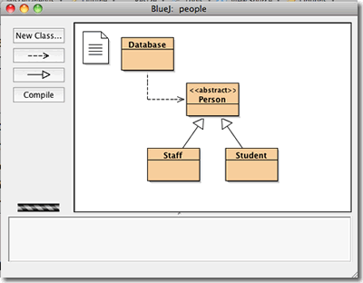 The main window with the boxes contains all of the classes associated with this project. In BlueJ, you don't have to compile the entire project at once. You can compile individual classes as you create or modify them to make sure they work correctly. The dotted line you see means the Person class uses the Database class. The solid lines indicate Staff and Student inherit from the Person class. Person is an abstract class, which means it defines methods and attributes for other classes but cannot you cannot make an instance of it. Person is also known as the base class for Staff and Student because both of those classes inherit from it. The Staff and Student classes are referred to as derived classes because they inherit attributes from a base class.