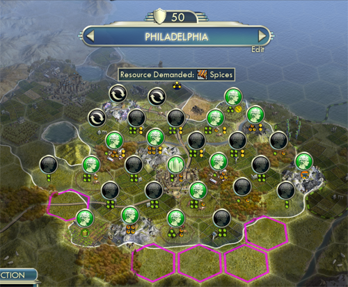 Philadelphia - Producing 27 food, 29 production, and 13 gold with a population of 12
